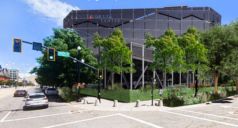 An updated rendering of the Delta Center parking garage with added landscaping elements. Image via CAA ICON and Walter P Moore and Associates